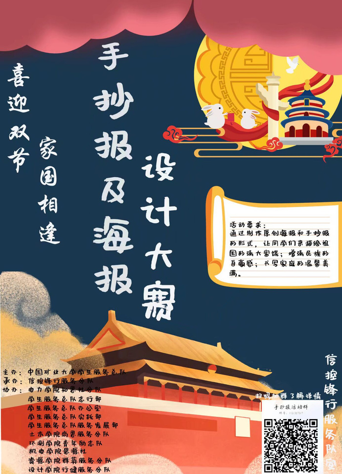 锋行服务队在假期中承办了“喜迎双节,家国相逢”手抄报及海报设计大赛。