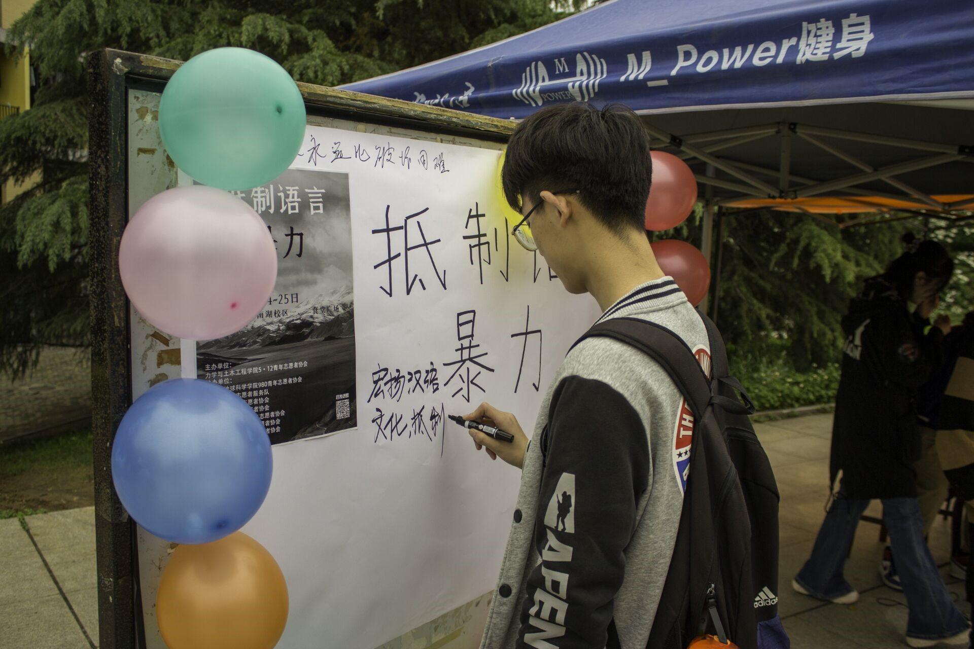 活动参与者踩下事先准备好的气球,里面藏有的符号代表着他们需要完成的任务,符号为“✔”的同学需要在横幅上写下抵制语言暴力的宣言并合影留念,而抽到“✘”的同学则需录制小视频表达对遭受抵制语言暴力者的鼓励。相关人员对路过同学进行随机采访,询问他们有关语言暴力的亲身经历、感受以及对此表达的意见和看法。活动后期,既有在自选卡片上写下抵制语言暴力文字的评奖比赛,也包括3至5人拍摄以“抵制语言暴力”为主题小视频或公益广告的比赛。此外还有相关的征文比赛。作品均发至指定邮箱,并于4月17号截止。参与的各成人游戏