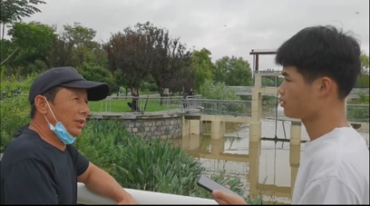 小组成员刘彤在云龙湖进行采访,并且积极和受访者交流了油烟净化技术对环境保护的重要意义。
