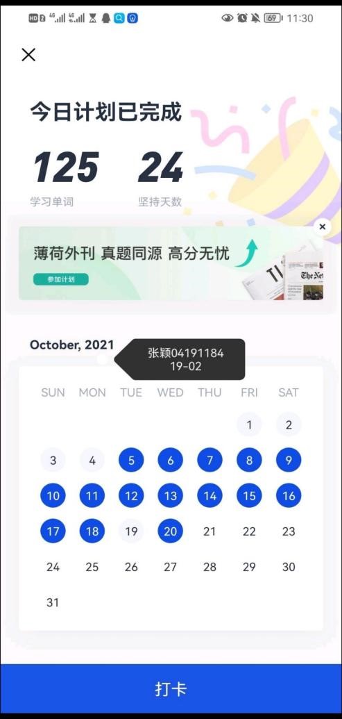 学生会于10月5日至10月25日开展了“21天习惯养成计划”——英语单词活动。本次活动以线上方式展开。