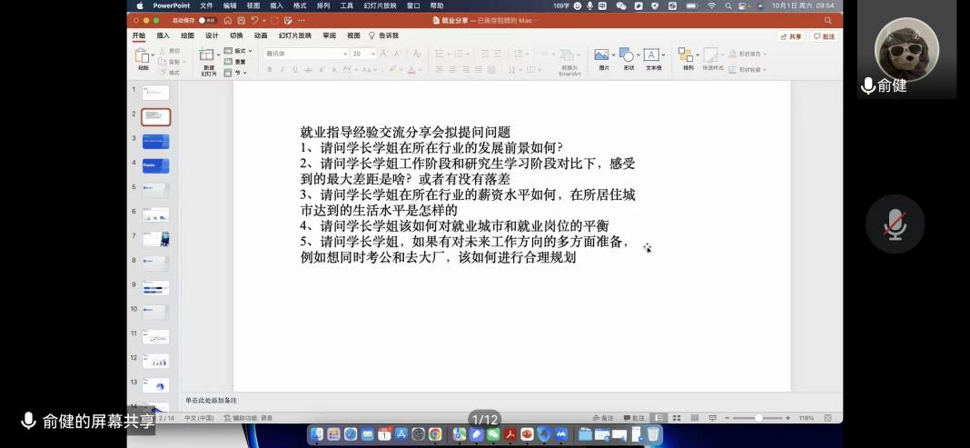 首先,主持人王毓泽代表大家向祖国送上生日祝福,祝愿祖国繁荣昌盛,国泰民安。随后胡杨明学长展开经验分享,从面试需要、自我经历的角度出发,向学弟学妹们传授如何在不到一年的时间内确定自己心仪岗位的方法。胡学长强调“打铁还需自身硬”,学好专业本领,全面性地修炼能力才是顺利就业的不二法门。之后本硕都在矿大求学的洪啟强学长为大家分析了就业的多样性,洪学长把就业的方向做了科学细致的划分,又耐心地为同学解答问题,面对就业岗位和就业城市的平衡问题,他更倾向于前者:“良禽择木而栖,有心仪的岗位就不要错过。”最后是俞健学长为大家分享,他首先展示了自己优秀的简历,从中大家深刻领会到了有过硬的实力和经历,也能轻松面对“卷”的就业环境。对于求职大厂,俞学长推荐大家多参与项目和实习,丰富自己的阅历和经验,合理安排好研究生生活,找工作的过程也是一个成长的过程。