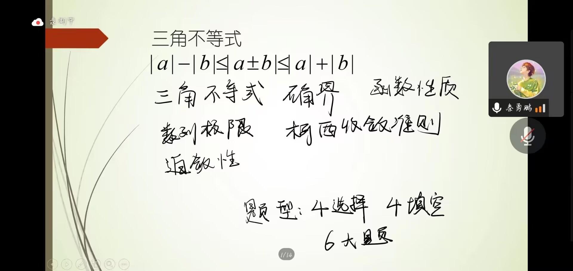 本次课堂中,两位同学根据知识点顺序,从函数的极限开始,对所学知识按板块进行了详细梳理,在简明扼要地讲解了主干知识后又结合例题,由浅入深地带领同学们回顾所学内容。期间,同学们针对题目内容以及解法踊跃发表看法,两位主讲人也热情地与同学们交流问题。在这一个半小时的课程中,课堂氛围一直保持着活跃,同学们收获颇丰。