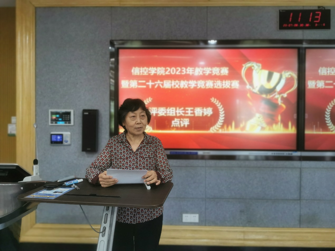 王香婷老师代表评委组对参赛教师进行了详细点评。王老师对参赛教师从教学设计到课件编写、从教学组织到教学方法运用、从讲课语言到时间把握的精益求精给与赞扬,同时针对说课环节以及课堂讲授教学环节完整性、讲述内容深度、问题引导、数字化教学手段运用、教学过程设计实施、知识总结拓展、案例分析和成果引入、教师讲课感染力等方面存在的问题进行了深入指导,对教师课堂讲授能力和综合教学技能起到了切实有效的帮助和提升作用。