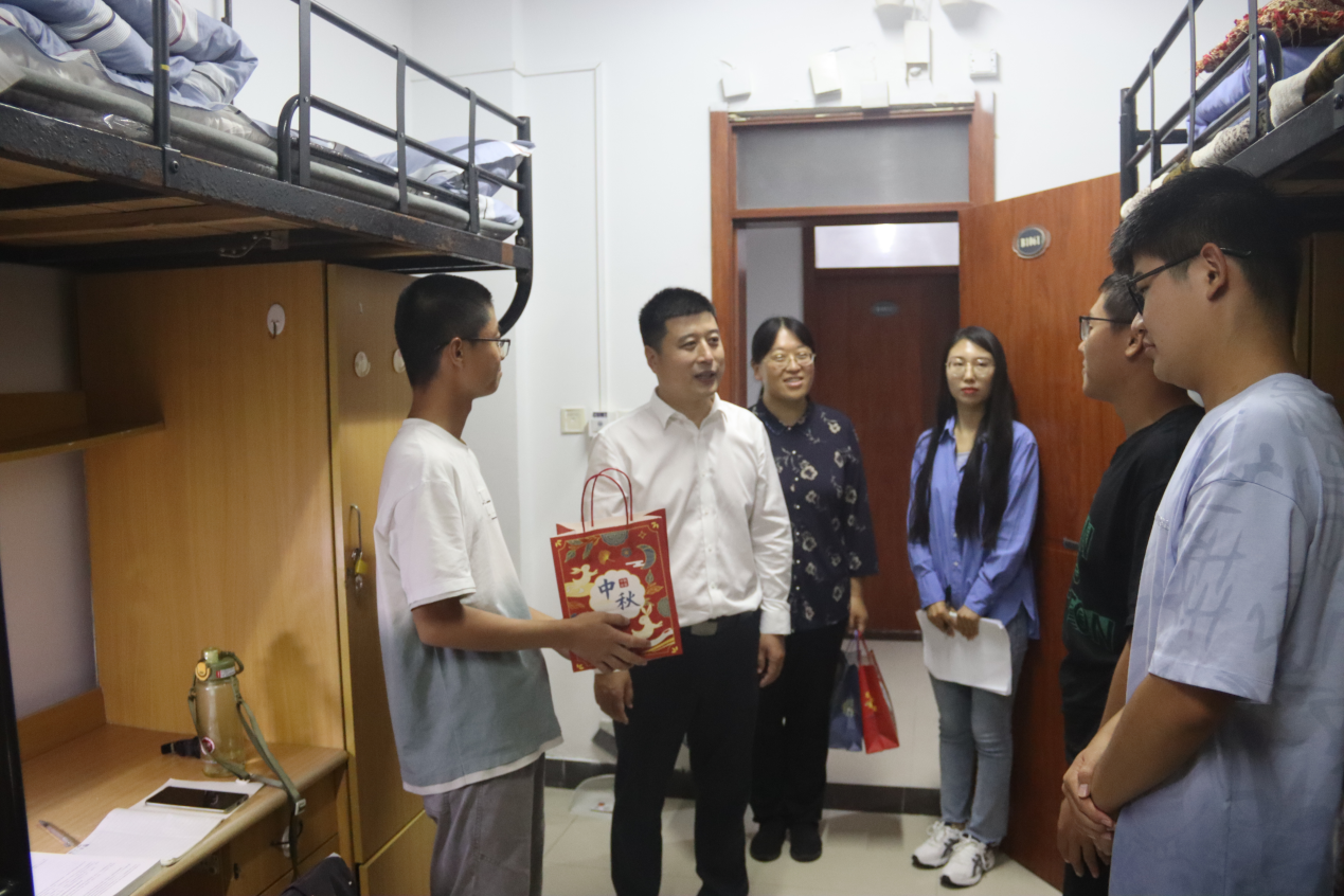 党委书记程德强、党委副书记翟文艳以及2023辅导员老师来到2023级学生宿舍走访慰问新生,为同学们送上月饼,并表达了节日的问候和祝福。