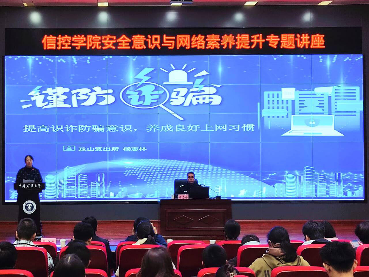 楼A101报告厅组织开展“安全意识与网络素养提升”专题讲座。校警务工作服务站驻校民警杨志林以《提高识诈防骗意识 养成良好上网习惯》为主题作讲座,徐州市公安局景区分局珠山派出所副所长邵珠义出席讲座,校党委保卫部保卫科科长石莹、珠山派出所民警殷晓彤、成人游戏
