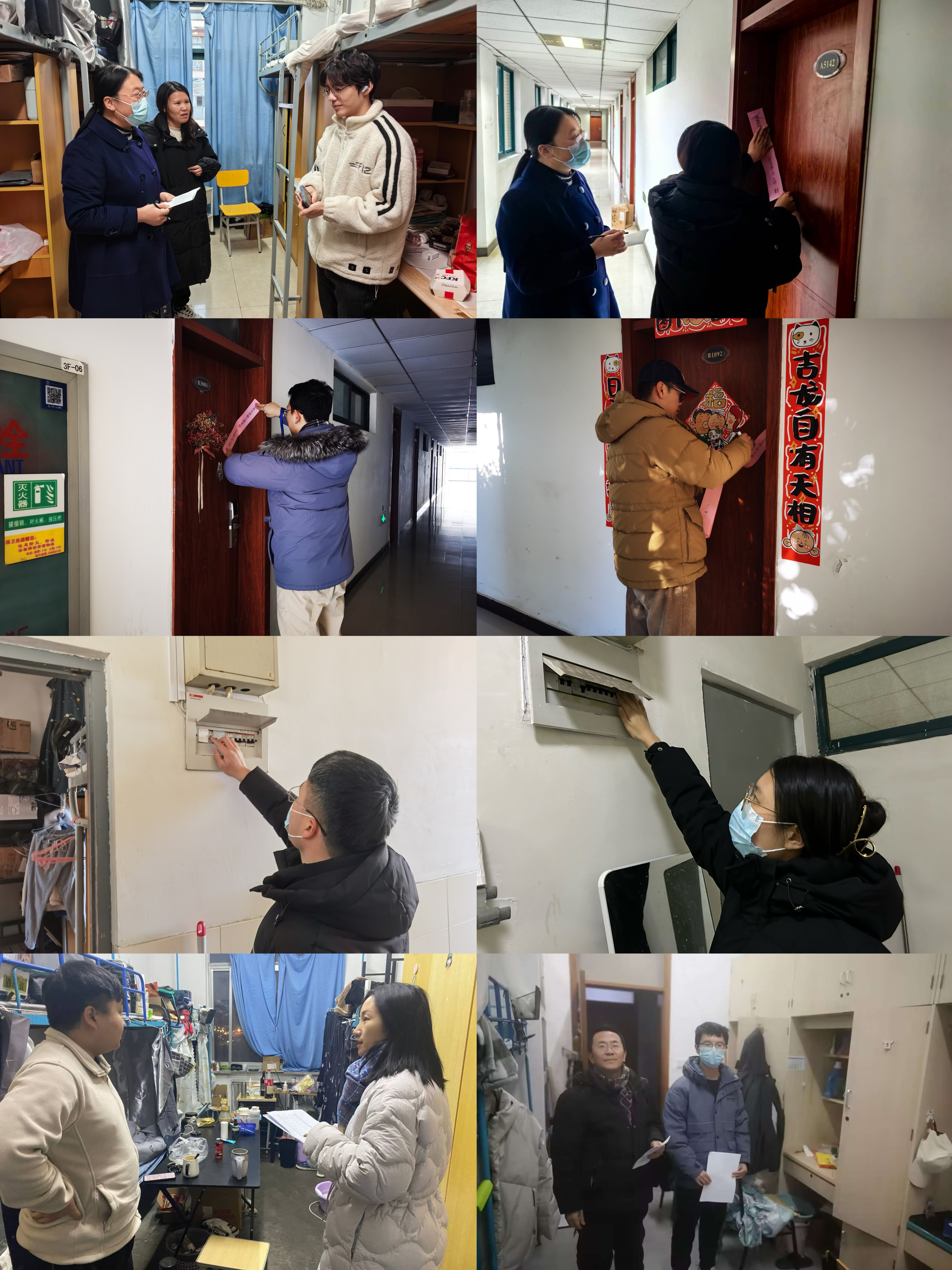 党委副书记翟文艳带队,对学生宿舍进行了走访和检查。检查组深入学生宿舍,对已离校学生宿舍内总电闸关闭等情况进行了检查,并张贴了封条;了解和关心未离校学生的学习和生活情况,强调要严格遵守宿舍管理相关规定,保障各方面安全。