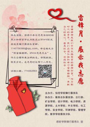 为了弘扬和学习雷锋精神,营造以志愿精神为荣氛围,表达对美丽的志愿者敬意,培养同学们乐于助人的品格,3月24日,信控成人游戏