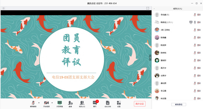电子信息类19-3班团支部在腾讯会议平台举行了团员教育评议班会。本次班会由团支书韩保闯主持,3班全体同学参加。